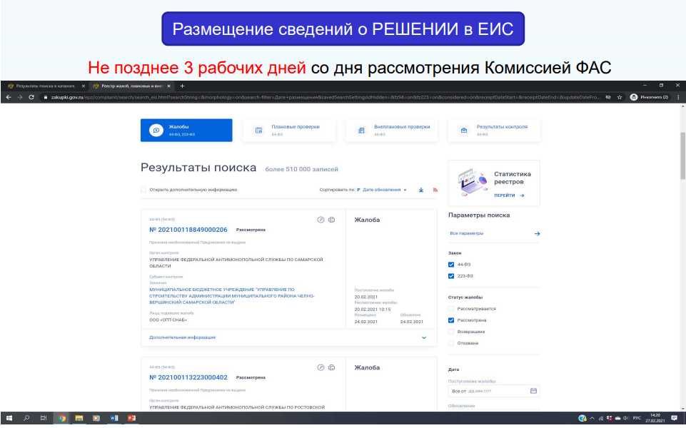 Порядок рассмотрения жалобы Предварительное рассмотрение Предварительное рассмотрение: Определение подведомственности жалобы Предварительное рассмотрение: Размещение сведений в Реестре Жалоб ЕИС Предварительное рассмотрение: Уведомление сторон Не позднее 3 часов с момента размещения информации в Реестре — электронное (через ЕИС) уведомление сторон: Рассмотрение жалобы по существу: Порядок рассмотрения 1. Проверка полномочий представителей сторон; 2. Открытие заседания комиссии; 3. Выступление сторон, лиц, чьи права […]