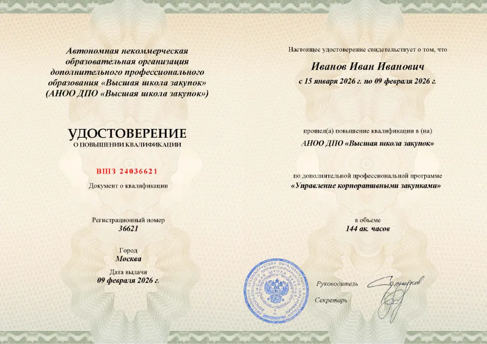 Вы получаете официальный документ о повышении квалификации. Высшая школа закупок (fz44.org) в обязательном порядке вносит сведения об обучении в Красноярске в реестр ФИС ФРДО, подтверждая легитимность вашей подготовки перед контролерами.