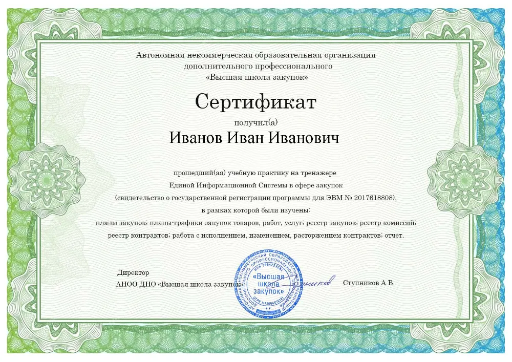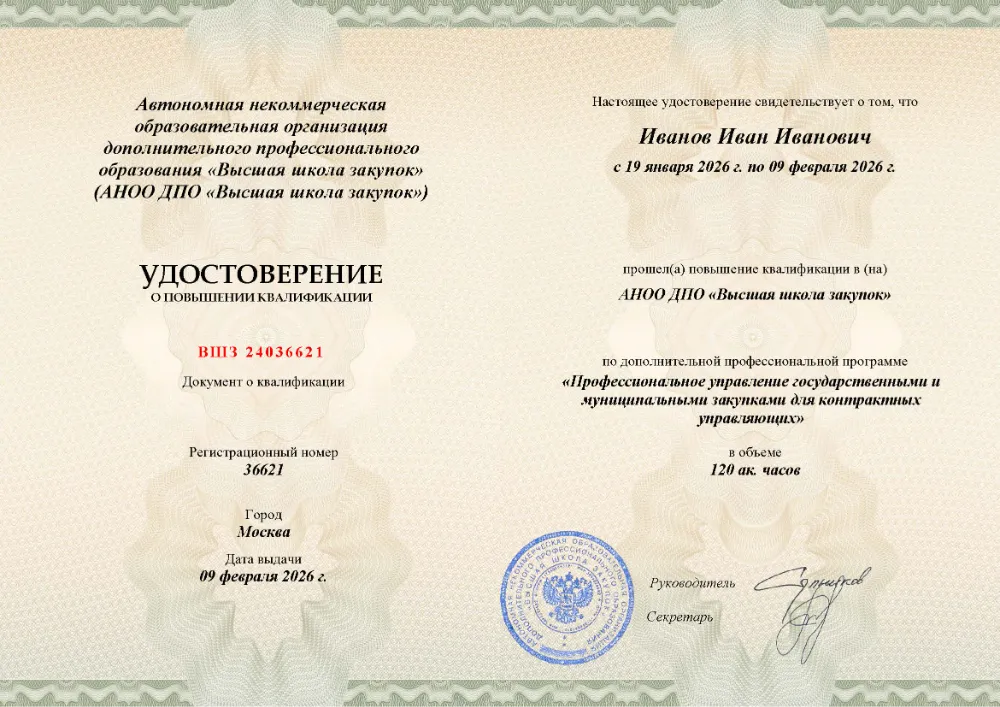 Вы получаете официальное удостоверение о повышении квалификации. Высшая школа закупок (fz44.org) обеспечивает передачу данных в реестр ФИС ФРДО, подтверждая соответствие вашей подготовки в Красноярске требованиям Минтруда.